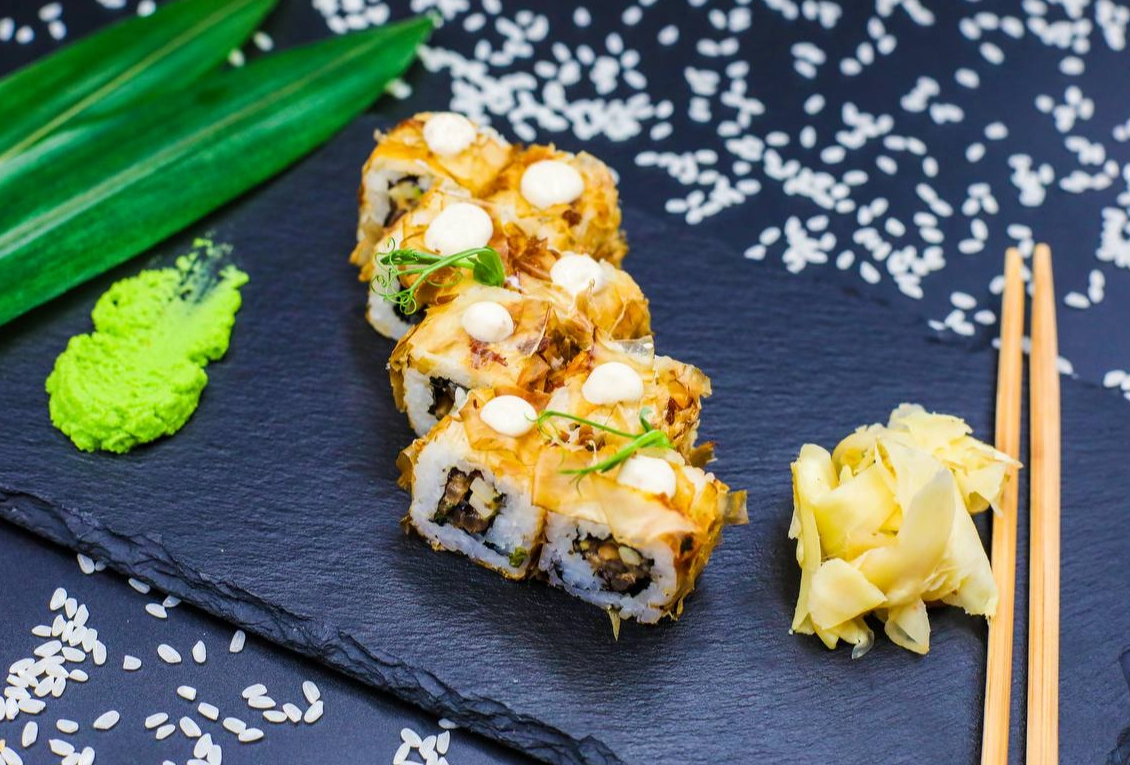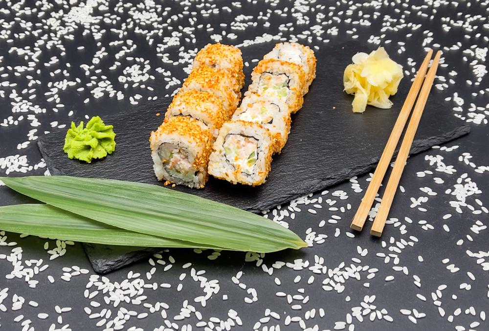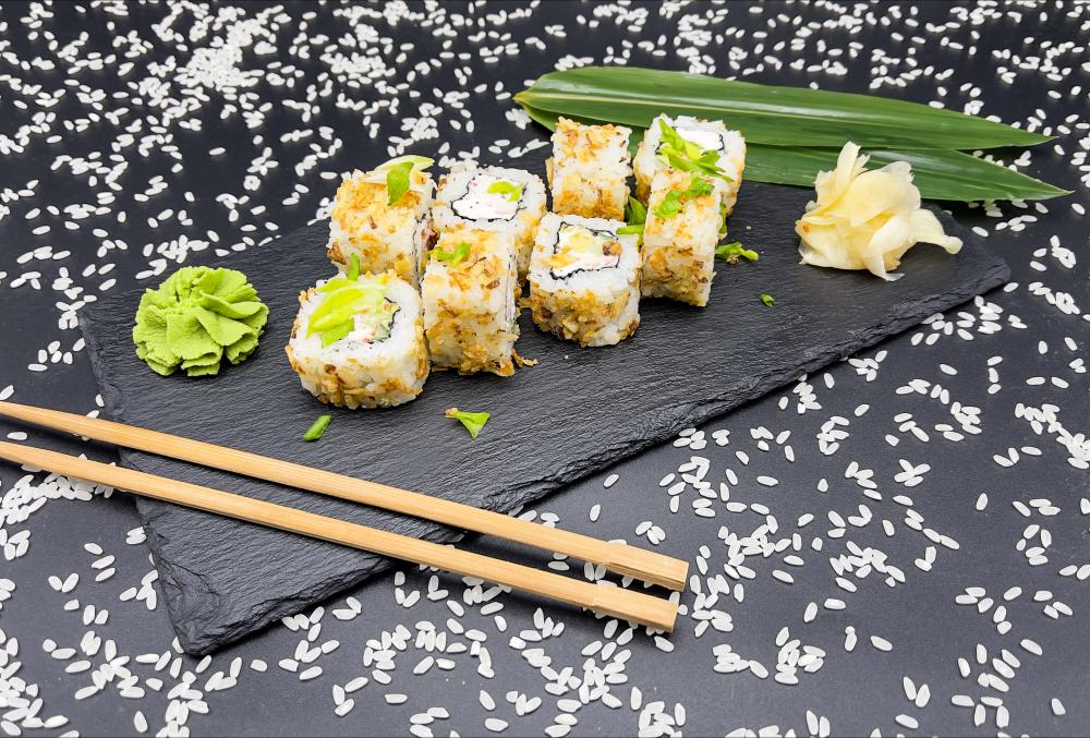 рис, нори, авокадо, снежный краб, сыр сливочный, огурец, соус чесночный, лук фри.