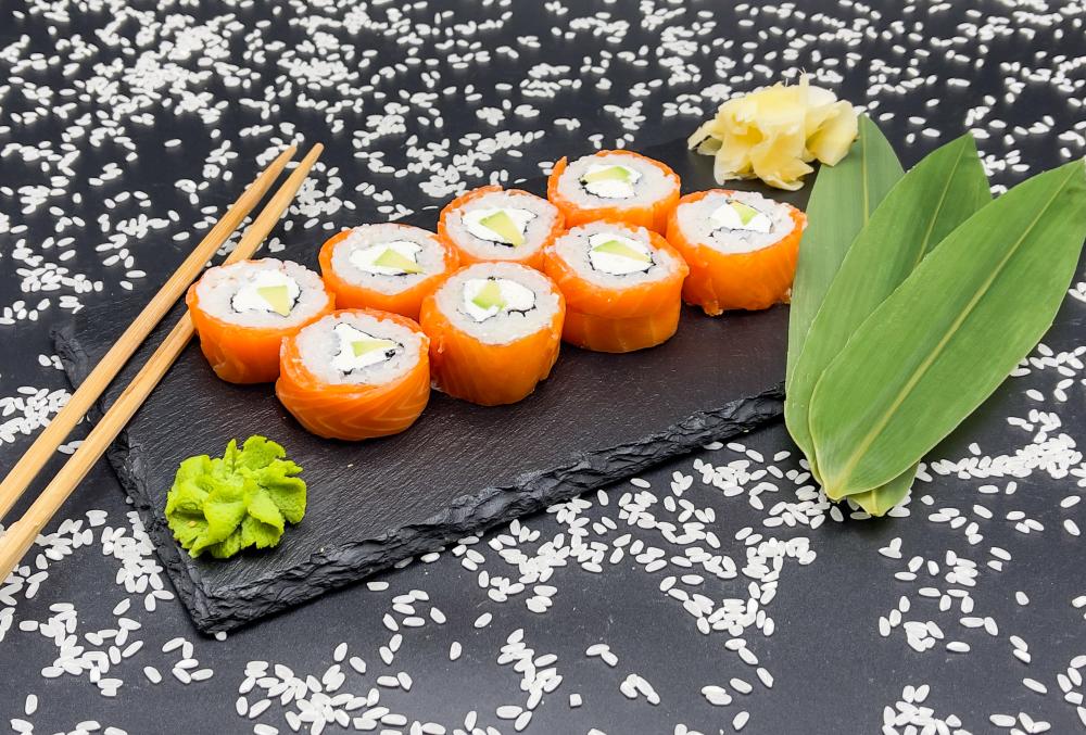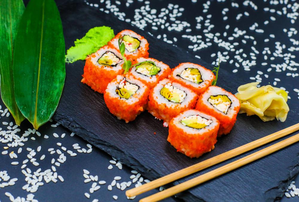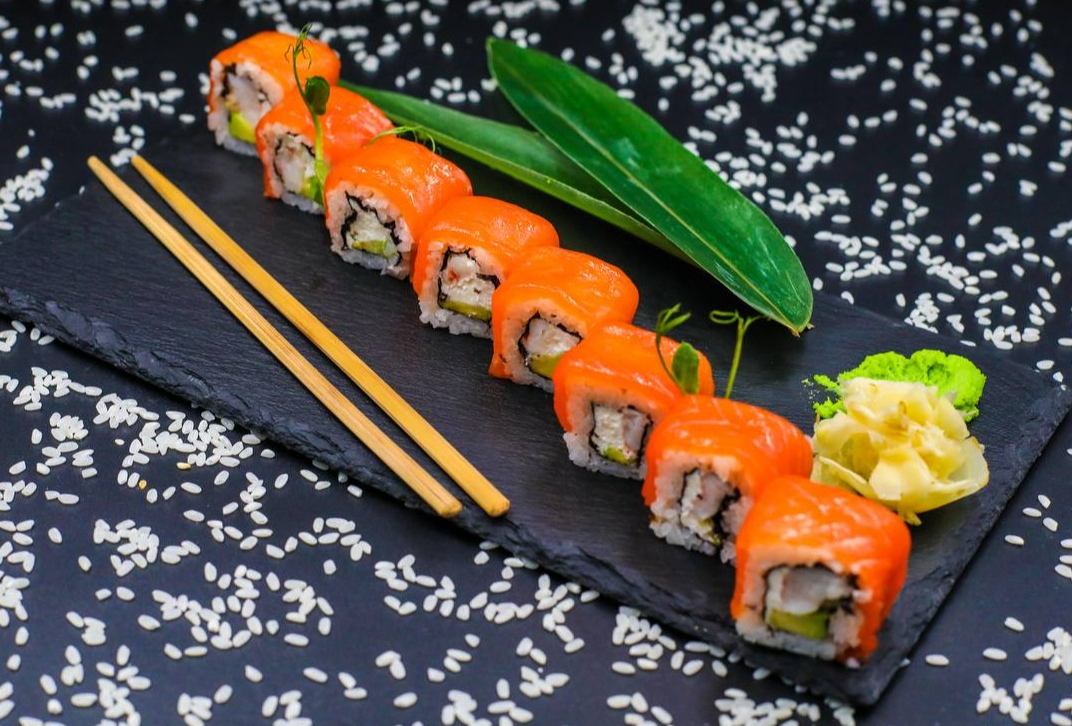 рис, лист нори, лосось, креветка, авокадо,