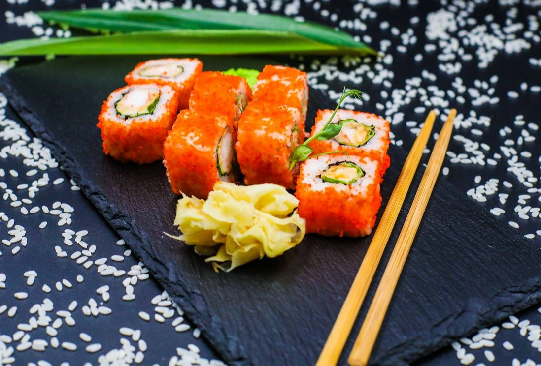 рис, лист нори, угорь, тартар, огурец, омлет томаго,