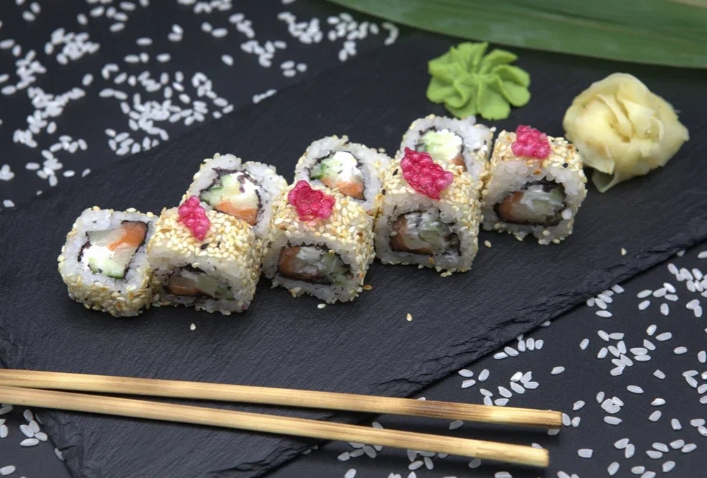 рис, нори, креветка отварная, криль, сыр сливочный, огурец, чили соус, кунжут кимчи.