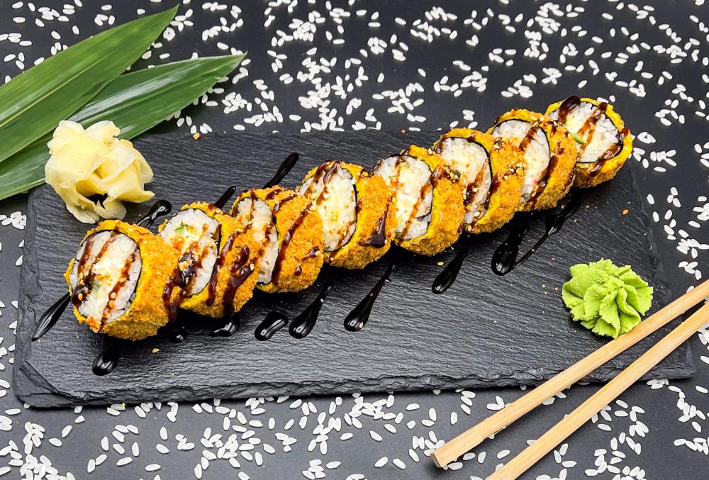 рис, нори, снежный краб, сыр гауда, майонез, чеснок, огурец, сухари панко, кляр, соус террияки, кунжут
