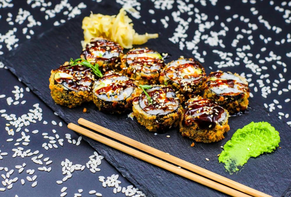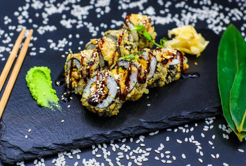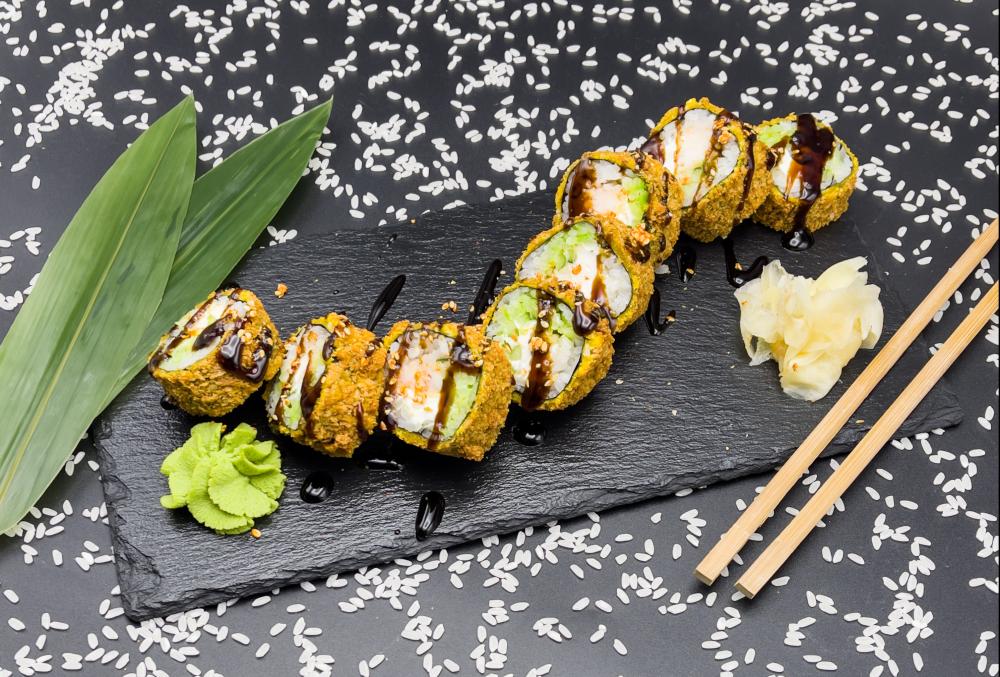 авокадо, тобико, кляр, сухари панко, соус унаги, кунжут белый