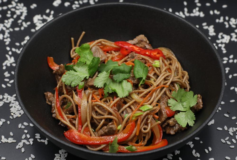 лапша соба, говядина, лук репчатый, морковь, перец болгарский, чеснок, соус унаги, соус соевый,