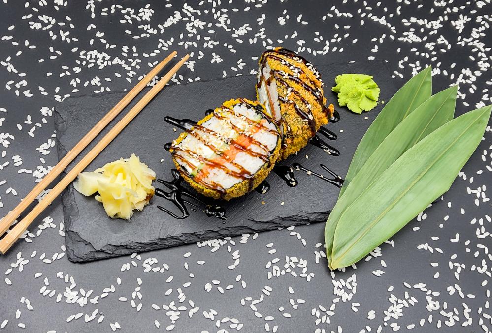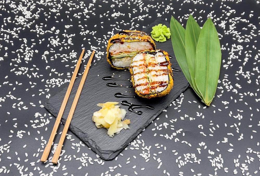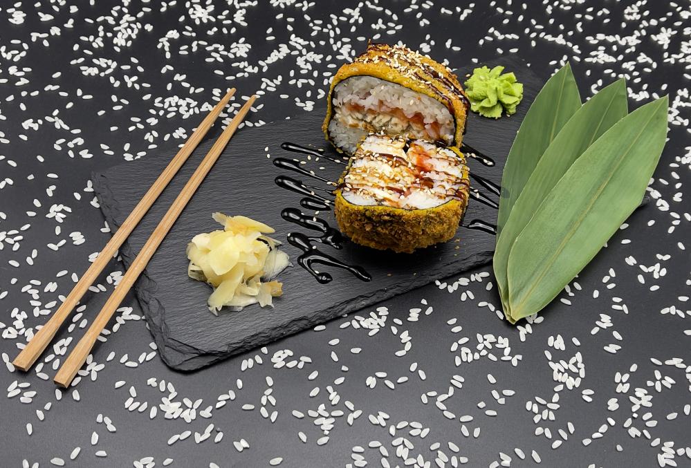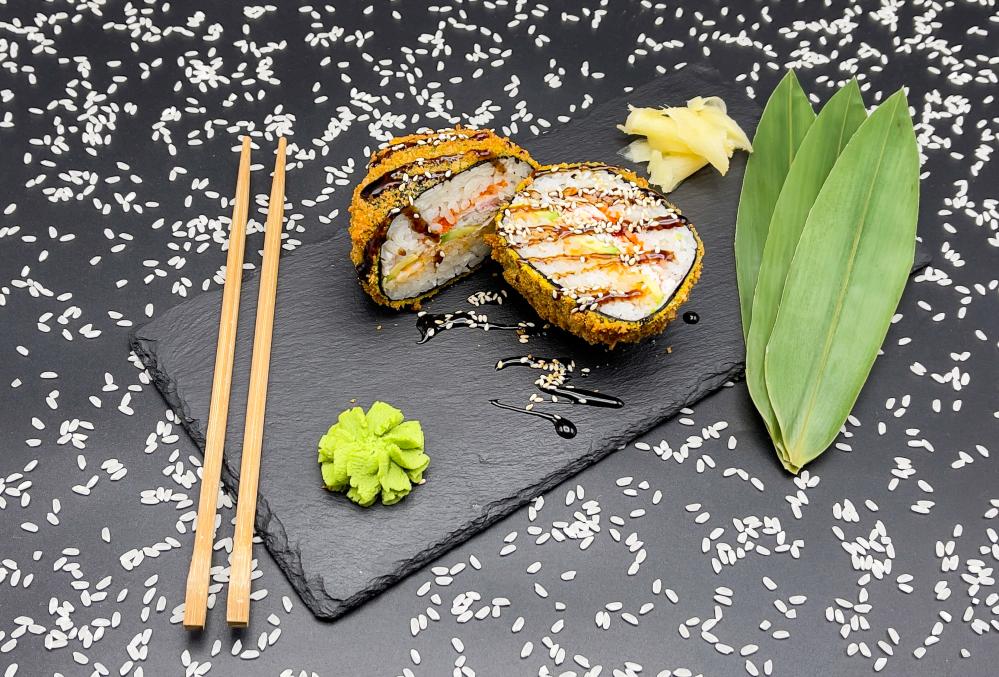 рис, нори, лосось, сыр сливочный, огурец, сухари панко, кляр, соус унаги, кунжут.